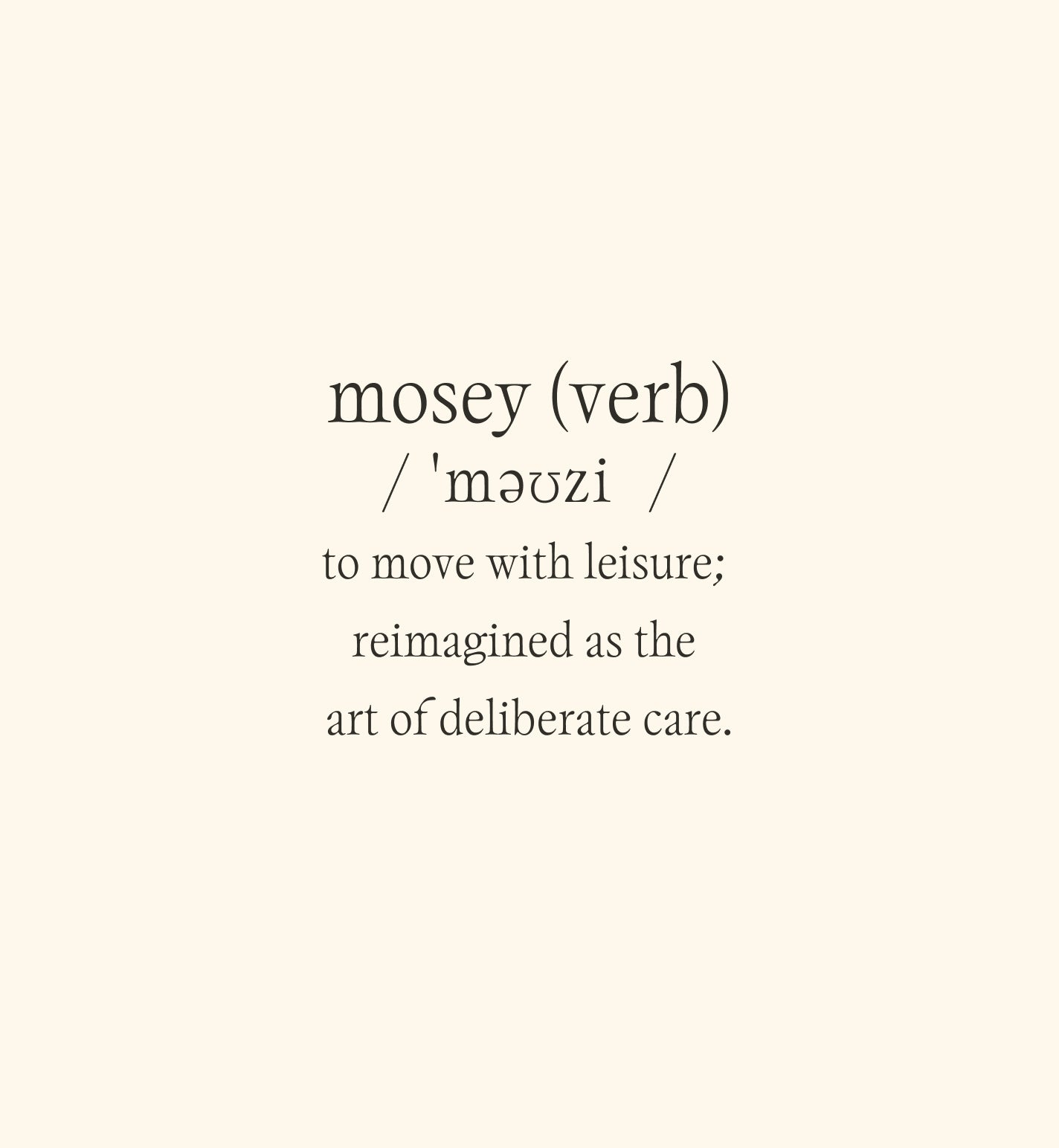 Mosey, in essence, means to move in a leisurely manner; it is from this spirit of leisurely grace that Mosey draws its inspiration.
